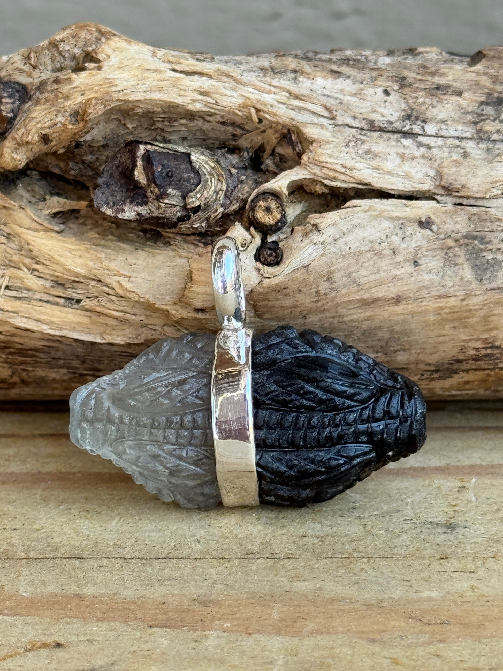 A unique and powerful pendant featuring a natural Bi-Colored Quartz crystal, hand-carved into a sacred double-headed snake and set on a pure sterling silver pendant.